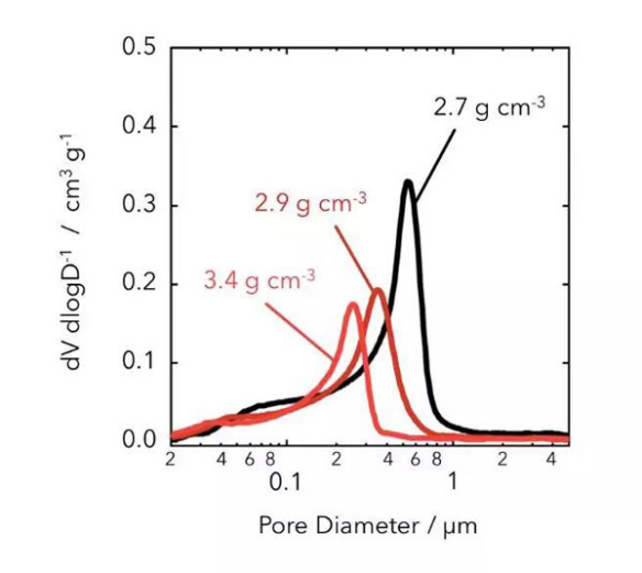 In the fabrication of lithium-ion batteries, compaction density has a large impact on battery performance. It has been proved by experiments that the compaction density is closely related to the sheet specific capacity, efficiency, internal resistance, and battery cycle performance. Finding the optimal compaction density is important for battery design. In general, the higher the compaction density, the higher the capacity of the battery can be made, so compaction density is also considered as one of the reference indicators of material energy density. The compaction density is not only related to the size and density of the particles, but also related to the gradation of the particles. Generally, the compact density has a good normal distribution of particles. It can be considered that under certain conditions of the process conditions, the greater the compaction density, the higher the capacity of the battery. Compaction density is an important parameter in the production of lithium-ion batteries. In order to increase the energy density, we generally want to increase the compaction density as much as possible. The figure below shows 2.7, 2.9 and 3.4g/ under the control of the same thickness. The change of the micropore size inside the electrode at the compacting density of cm3 can be seen from the figure, as the compaction density is gradually increased, the size of the micropores inside the electrode is also gradually reduced.